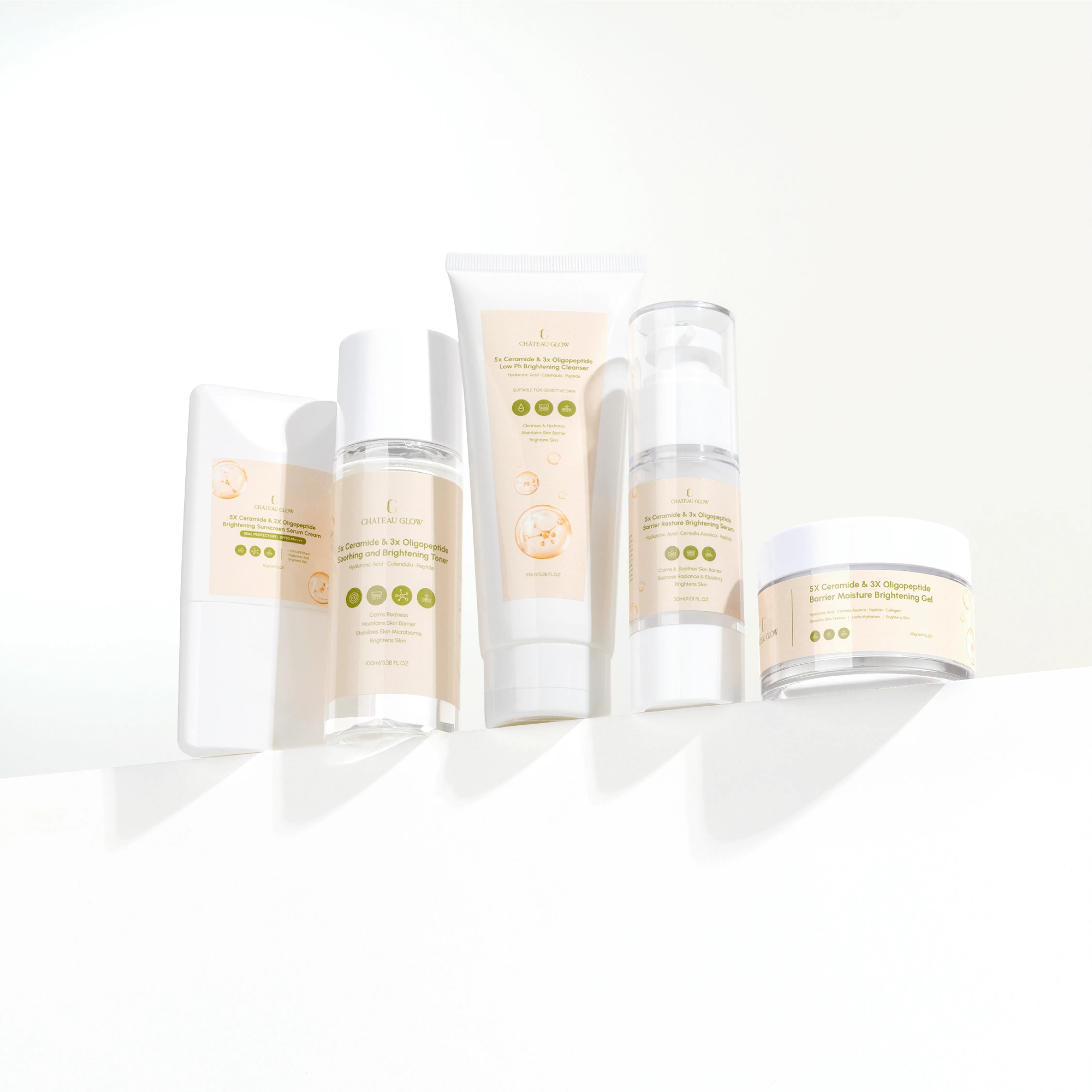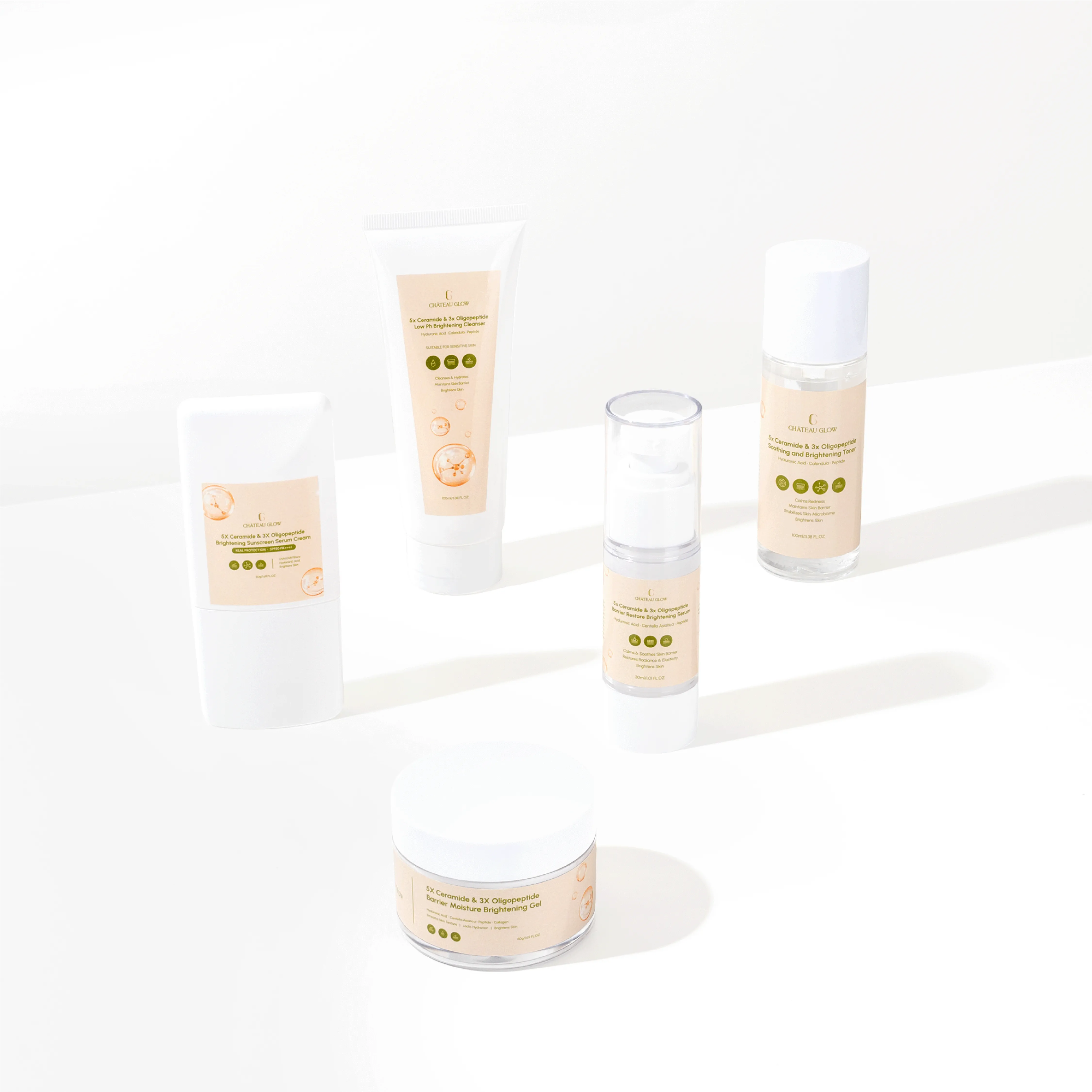 Nourish, protect, and restore your skin with the Château Glow Set Package – a powerhouse 5-step routine infused with 5x Ceramide and 3x Oligopeptide to repair your skin barrier, brighten dullness, and lock in long-lasting hydration.